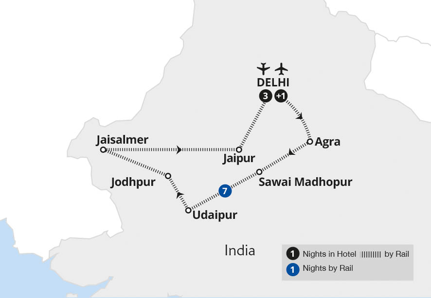 Travel in luxury on this palace on rails when you embark on the journey of a lifetime on the Maharaja's Express. This iconic journey begins in the vibrant city of Delhi and takes you to the Golden Triangle of Delhi, the Taj Mahal, Jaipur, and a tiger spotting safari in Ranthambore National Park. Visit the mesmerising desert citadel of Bikaner...