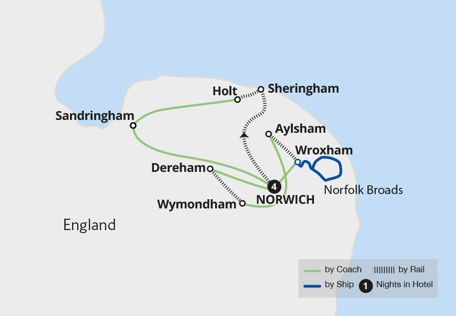Discover the rich heritage and natural beauty of Norfolk and Norwich on a journey filled with historic railways, waterways and royal charm. Explore the medieval city of Norwich on a guided tour, cruise along the Norfolk Broads on a Mississippi paddle boat and step back in time on scenic journeys with the Mid and North Norfolk railways. We...