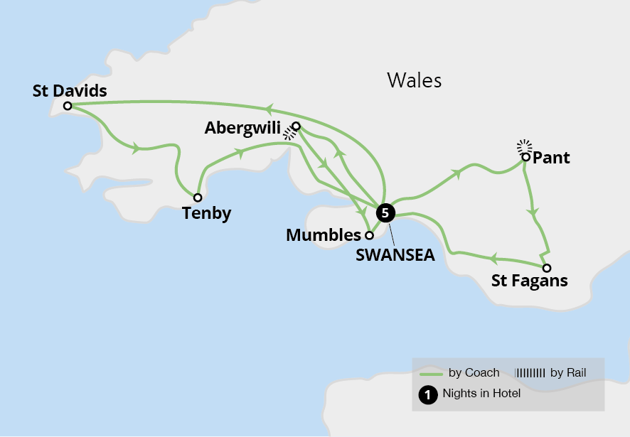 Join us on this delightful getaway to discover the unspoilt rural beauty and hidden treasures of South Wales - with trips aboard nostalgic steam trains into scenic, rugged landscapes, and exploring charming towns. From our base in Swansea, we journey on the Brecon Mountain Railway through the wonderful landscapes of the Brecon Beacons, ...