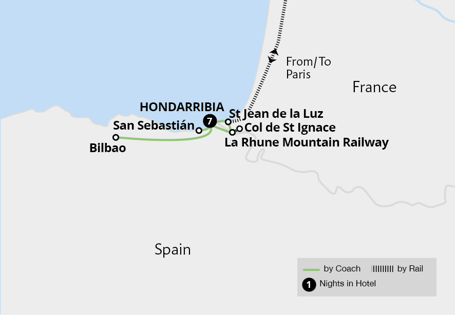 Explore the beautiful Basque coast of Spain and France from the seaside town of Hondarribia. Visit picturesque fishing towns and stylish cities, discovering the cuisine, art and culture of this fascinating region in San Sebastián and Bilbao's Guggenheim Museum. Board the nostalgic carriages of the Petit Train de la Rhune for a stunning...