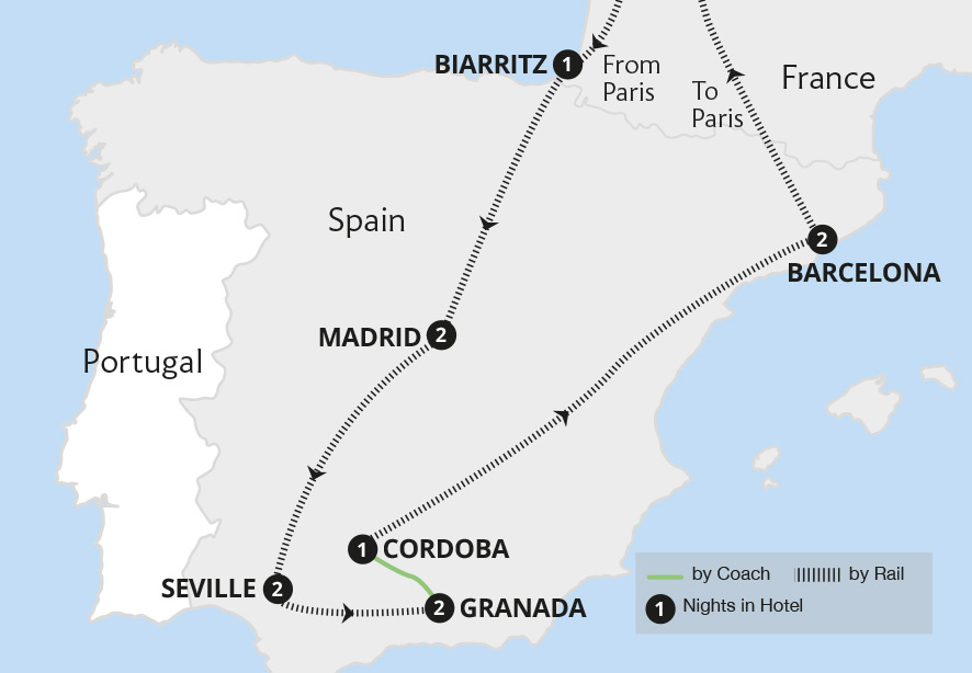 Journey by rail through Spain's most captivating regions - from the vineyard -covered hills of Rioja to the grand architecture of Córdoba and Seville. Explore charming rural villages, sip local wine in rustic taverns and discover the rich culture that makes Spain truly unforgettable.