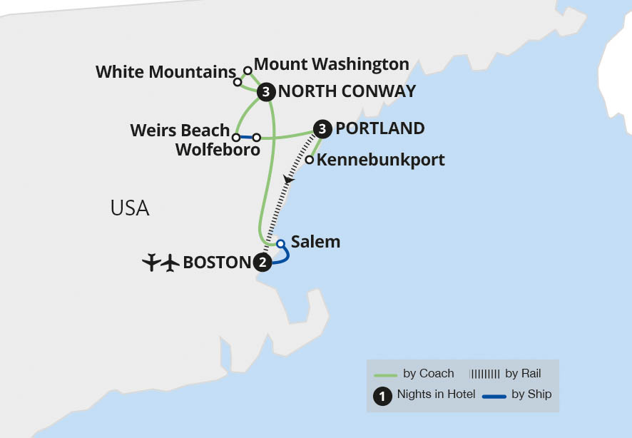 On this new itinerary for 2026, experience scenic railways on an unforgettable tour of New England in the Fall. Travel through spectacular mountain scenery lit up with vivid colours on this autumn tour along America's scenic East Coast. Stay in Boston with time to explore its history and culture, then journey by boat to fascinating Salem. ...