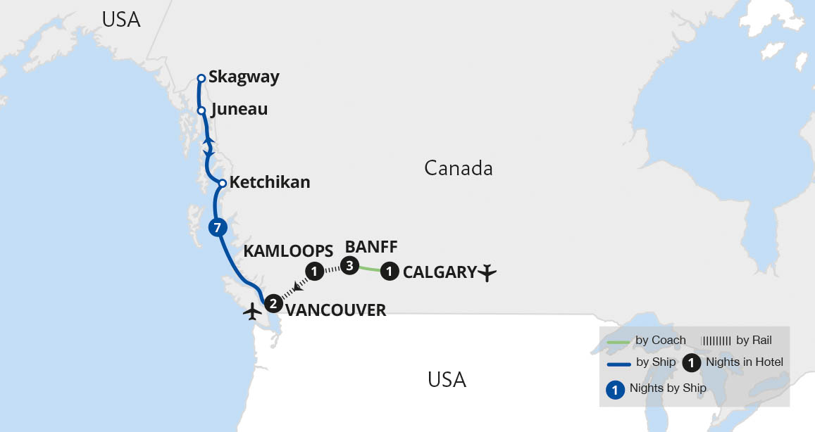On this once-in-a-lifetime tour you'll begin by exploring the alpine resort towns of Banff, Lake Louise, and Jasper, before boarding VIA Rail's Canadian train for a trip through the Canadian Rockies to Vancouver. After exploring the exciting city of Vancouver, you'll swap the rails for the waterways when you board your cruise ship to take you...