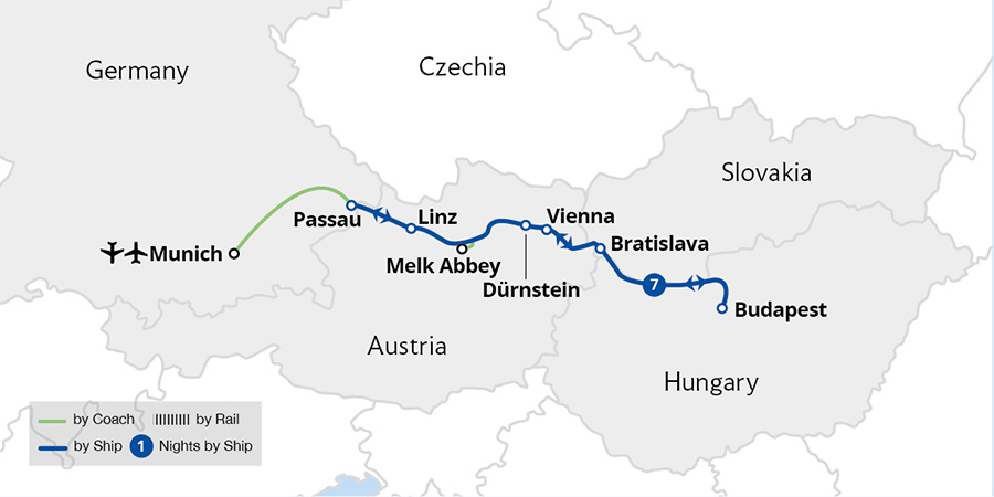 Fly to and from Munich to enjoy a leisurely cruise through four countries and three capital cities, basking in beautiful river scenery all the way. Sail from the German border town of Passau through the Austrian wine-growing region of the Wachau Valley, admiring picturesque Dürnstein and commanding Melk Abbey enroute. After exploring ...