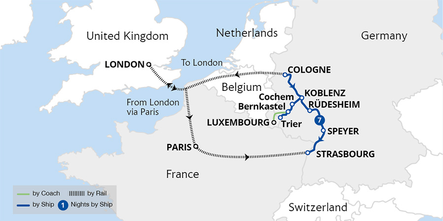 Flowing effortlessly from France's Vosges Mountains, the Moselle River winds through Luxembourg before meeting the Rhine in Koblenz. Along this scenic route through one of the world's premier wine-producing regions, discover picturesque landscapes covered in tiered vineyards, medieval castles and charming villages that have inspired travellers for centuries.