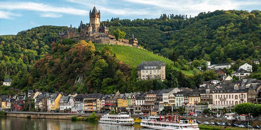 This charming medieval Old Town is the gem of the Moselle Valley. Nestled amongst the steep vineyards, it's known for Riesling wine, cosy taverns and panoramic views. Looking down on Cochem is the iconic Reichsburg Castle built in the 11th century, a stunning neo-Gothic fortress perched on the hill.