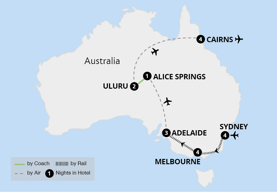 Join us on an epic adventure into this vast, vibrant and varied land to experience Australia's spectacular natural wonders, from the rainforests of tropical Cairns and kaleidoscopic colours of the Great Barrier Reef to the burnished red tones of the ancient sacred site of Uluru. Explore laid-back Adelaide and its world-acclaimed wine region...