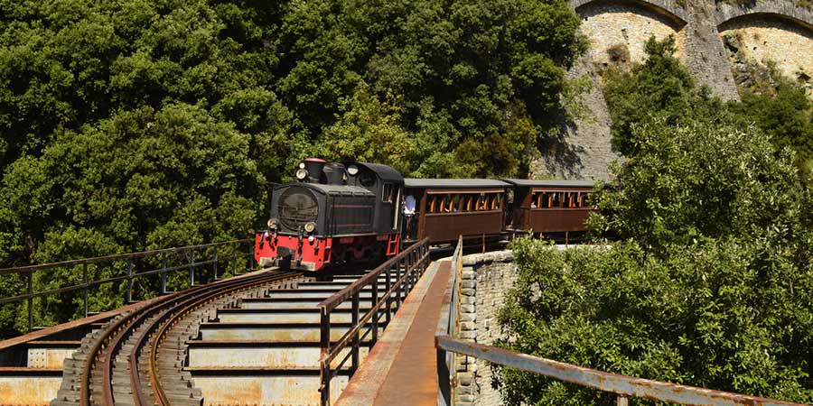 The train's journey is steeped in the mythos of Greece, and crosses the legendary routes of the Centaurs. Ancient Greek mythology has it that Pelion was the summer habitat of the twelve gods of Olympus. The station of Milies reportedly sits close to the site where Pileas and Thetis were wed, the parents of Achilles. Another mythical site is passed by on the final turn of the track before Milies. In one of the many gorges the train passes through, a mythical cave awaits, said to be that of Centaur Chiron, an important figure in Greek mythology. Chiron was the teacher of Achilles, it is said that he gave Achilles the spear that he eventually wielded in the Trojan War. The cave is at the base of the rock where the chapel of Taxiarchis is found today.