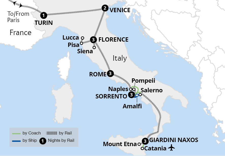 Bask in the beauty of the Amalfi Coast and marvel at the remains of ancient Pompeii before venturing by train to Sicily - home to Mount Etna.
