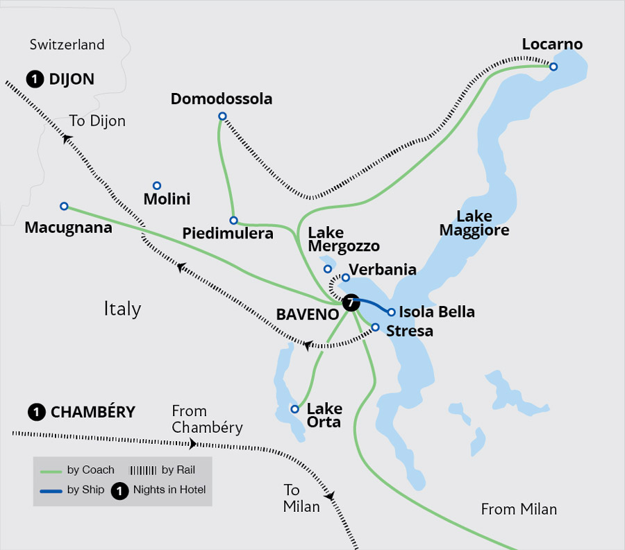 Explore the serene beauty of Italy's lakes from a base in the attractive town of Stresa, a haven for artists and writers over the centuries nestled on the shore of Lake Maggiore. Enjoy a cruise to an island monastery on Lake Orta and explore the lakeside village of Orta San Giulio. Journey through the Alps to Switzerland on the Centovalli...